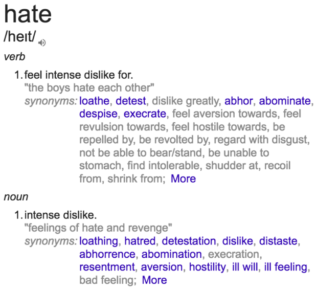 Hate is an emotion characterized by intense dislike for something.