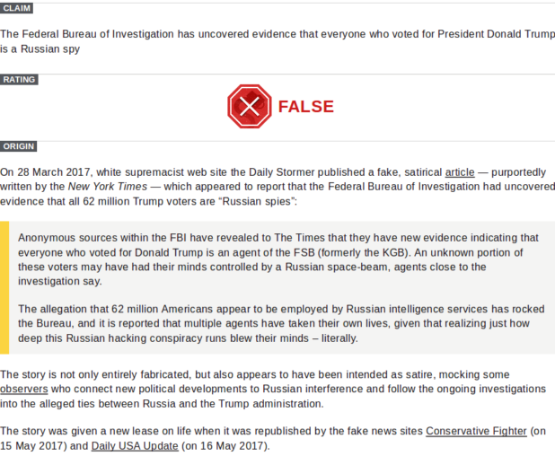 THE FACTS: The satirical article was republished from The Daily Stormer last week following real headlines of the investigation into the Trump campaign’s connections with Russia. The original piece quoted anonymous sources in the FBI with evidence the voters were KGB agents. One truth in the headline: More than 62 million Americans did cast votes for Trump last Nov. 8 and elected him president.