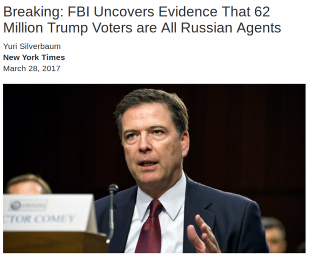 So a while back, I wrote a satire article about the FBI uncovering that all 62 million Trump voters were either working directly for the FSB, or had their minds controlled by Russia space beams.