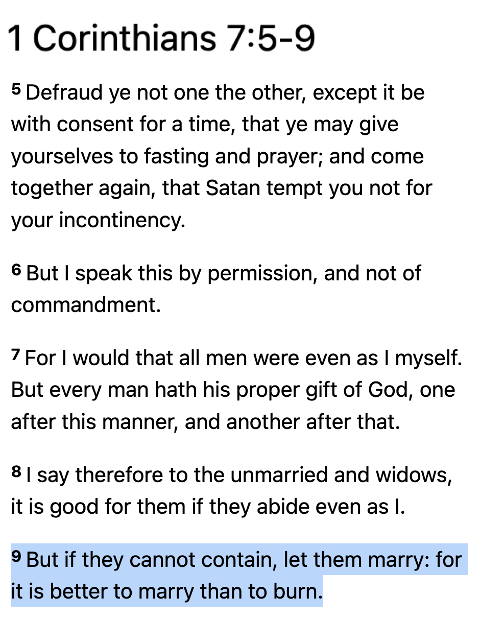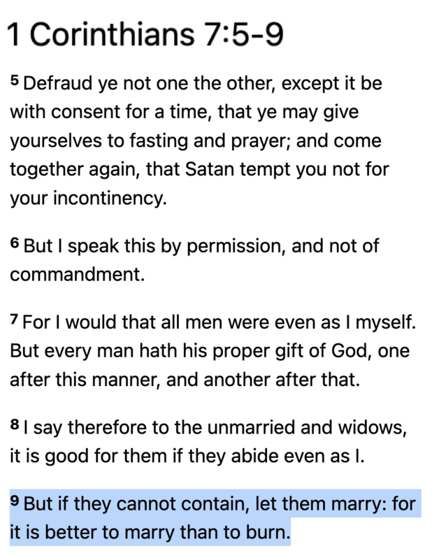 Saint Paul didn’t stutter on this issue: celibacy is preferred, if a man is capable of it, but if he’s not, there’s nothing wrong with marriage. This is from Corinthians, so it is a letter to the church leadership (he obviously wasn’t saying that most people in general should try to be celibate):