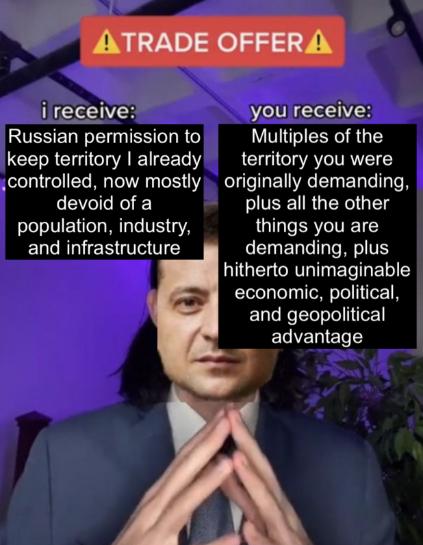 Even discussing negotiations at all is a big signal, though that is still being observed. Remember that Boris Johnson flew in in April of 2022 and ordered Zelensky not to negotiate for peace. Zelensky had publicly stated that he was willing to surrender the Donbass and agree to neutrality. Following that, Zelensky signed a decree that made it illegal to ever negotiate with Russia. (He can obviously sign a decree rescinding that decree, because the Ukraine is a vibrant democracy.)