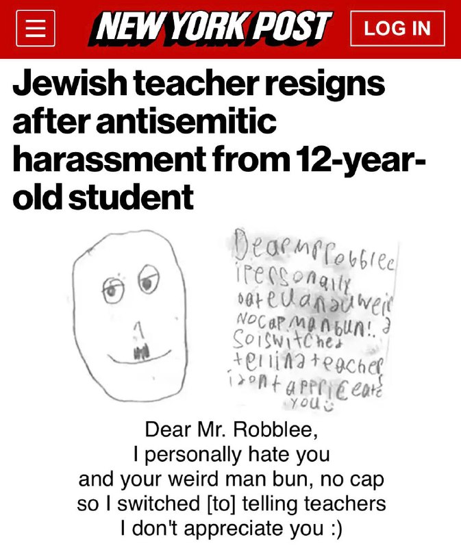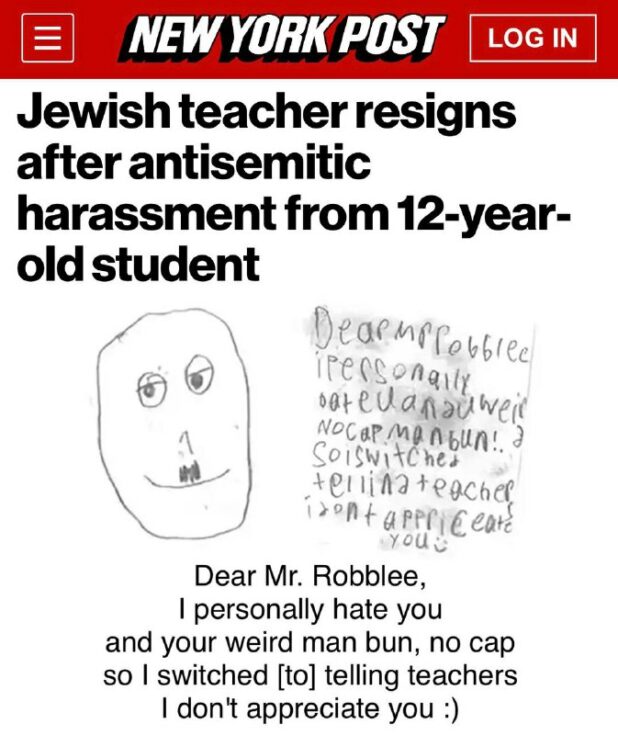 The principle figure in the cascading collapse of appreciation of the Jews – as well as the rapidly rising levels of unappreciation for Jewish culture, customs, and domination – is a 12-year-old boy who sent a picture he drew of Hitler to his Jewish teacher. The smug looking Hitler drawing included a note pointing out that the boy no cap does not appreciate this Jew or his man bun.