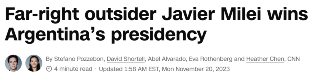 Javier Milei has won Argentina’s presidential elections in provisional results, wrenching his country to the right with a bombastic anti-establishment campaign that drew comparisons to that of former US President Donald Trump – all against the backdrop of one of the world’s highest inflation rates.