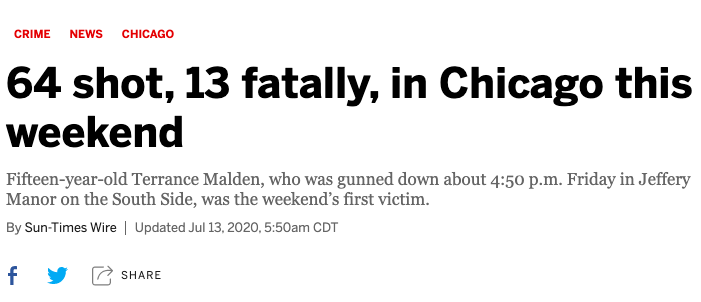 Ten unarmed blacks were killed by cops in all of 2019. 13 blacks were killed in Chicago last weekend.
