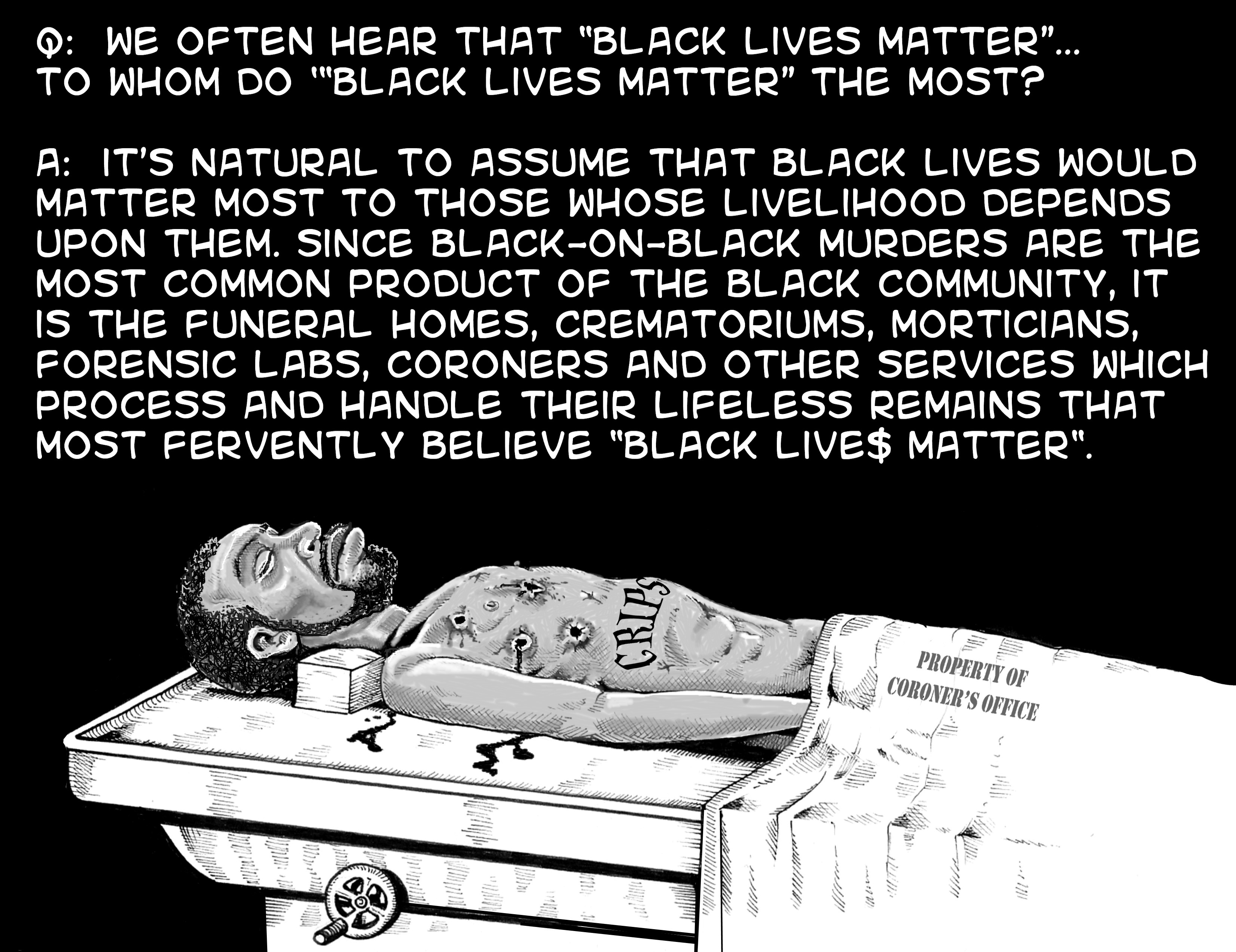 Between 6,000 and 7,000 blacks are shot to death by other blacks every year, yet they want to burn down the country over ten guys killed by cops, because “black lives matter.” If it was actually about saving black lives, they would be talking about the thing that kills hundreds of times more blacks than the cops – other blacks.
