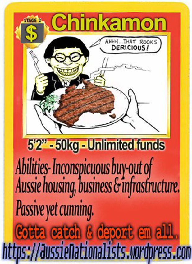 Gook poster. This one will definitely resonate with a lot of Australians, especially young people that cannot afford to buy a home because Chinamen are buying up all the prime real estate and raising the property costs around them.