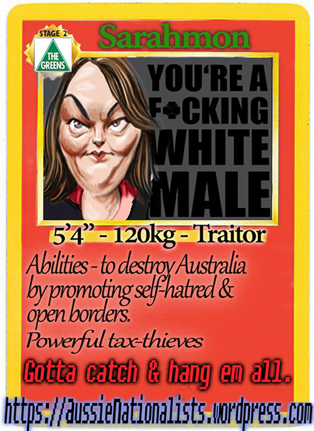 Sarah Hanson-Young’s poster. She’s a senator that joined the coloreds in their anti-White agenda, as White women often do.