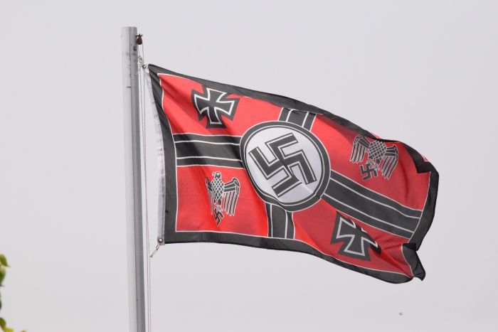 The red and black flag resembles a Wehrmacht flag, which was used between 1935 and 1938 to represent the armed forces of Nazi Germany.