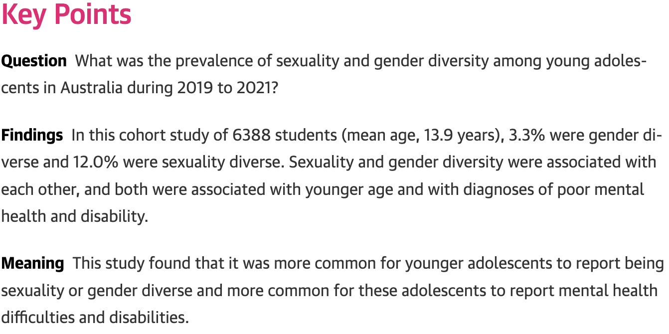 Marino said that finding warranted more research. “We have long known that both sexuality- and gender-diverse … older adolescents and adults have increased risk of various mental health issues relative to their cisgender, heterosexual peers. The evidence all points to minority stress as being the principal driver of that – discrimination and stigma that affect health and social standing,” they said. “I don’t have any reason to think that younger adolescents would be any less vulnerable than their older peers.”