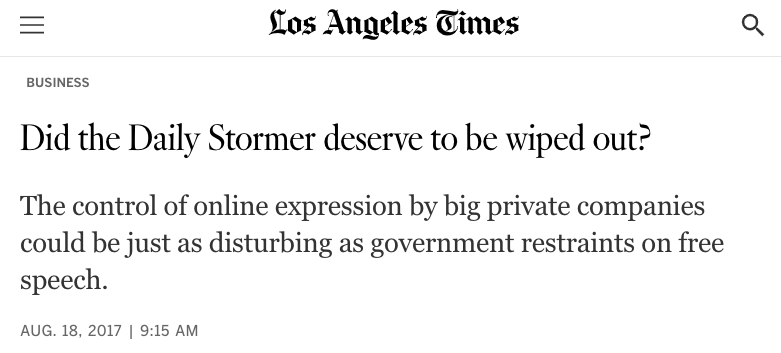 (I will say again that I’m not trying to make this about Daily Stormer, it’s simply a fact of reality that we were the first ones to have the hammer come down on us, totally. It is a fact that I am proud of, of course. I think I should be proud that it was my site, which was mostly at the time just dealing in shock humor for teenagers, that was considered the biggest threat to be taken down first. But if someone else were banned first, it would be the same deal: people would need to rally around them, because the slippery slope is real.)