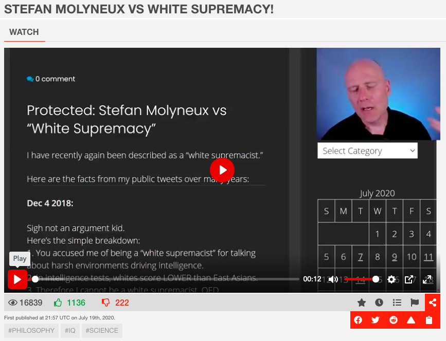 I want to say that I haven’t been following Molyneux, and he may or may not be putting out some good information. Scanning his BitChute channel, we find that the most popular video of the last two weeks – with a whomping 16,839 views at time of writing – is an attack on “white supremacy” (a Jewish hoax that doesn’t even exist in real life).