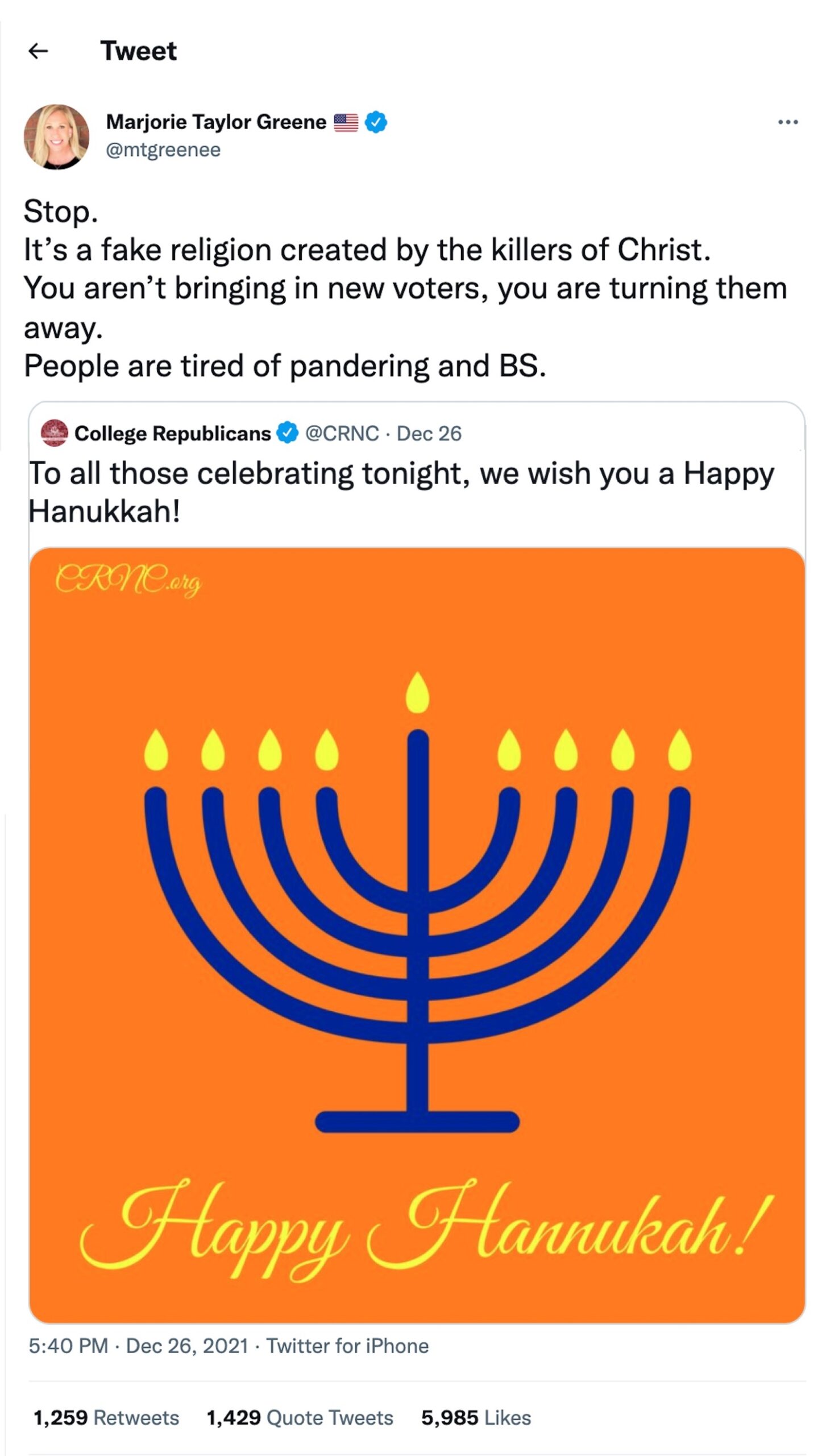 People are tired of pandering and BS. https://t.co/NrhE6O6BG5— Marjorie Taylor Greene 🇺🇸 (@mtgreenee) December 26, 2021