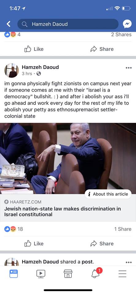 “I’m gonna physically fight Zionists on campus next year if someone comes at me with their ‘Israel is democracy bullshit’ :),” student Hamzeh Daoud, a self-described Muslim and third-generation Palestinian refugee, wrote Friday on his Facebook page.