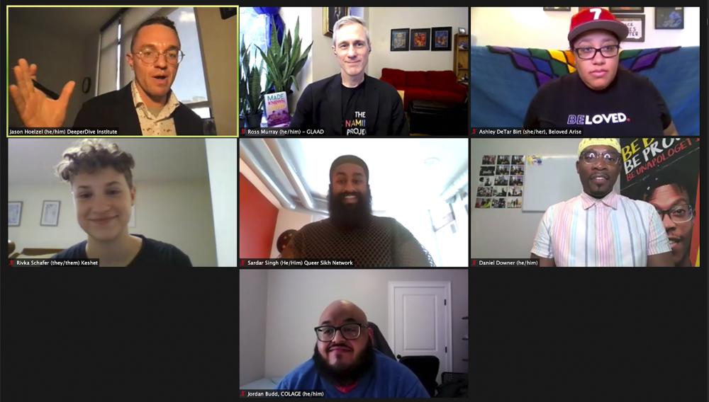 Jason Hoelzel, religious literacy and media specialist of the DeeperDive Institute, top left, moderates a panel on youth advocacy and ministry, hosted by GLAAD and Beloved Arise.