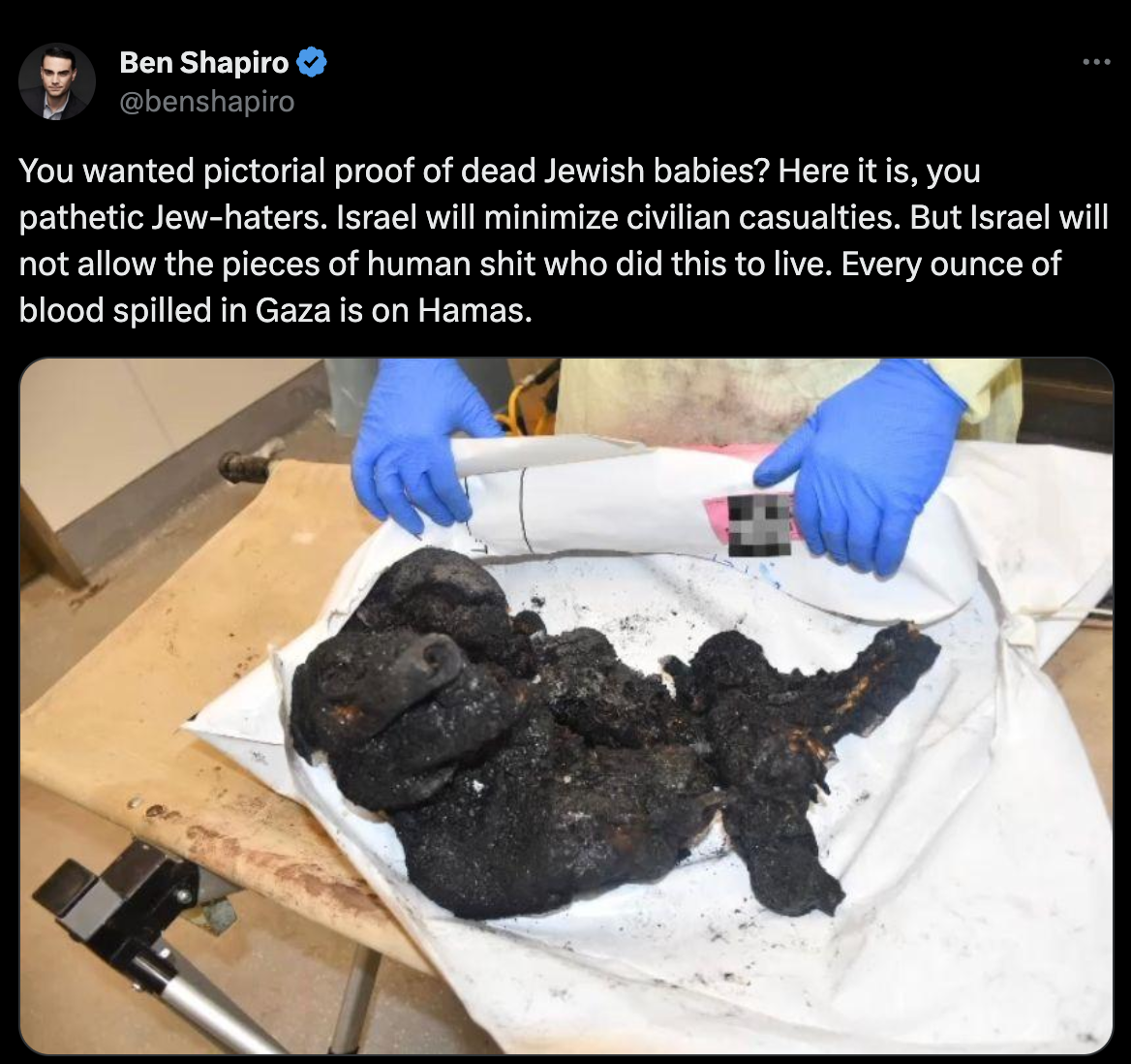During this kerfuffle, Ben Shapiro – good old Benny – decided to post a picture of a burned baby (as proof of 40 decapitated babies). In the tweet, he also justified a coming genocide in Gaza.