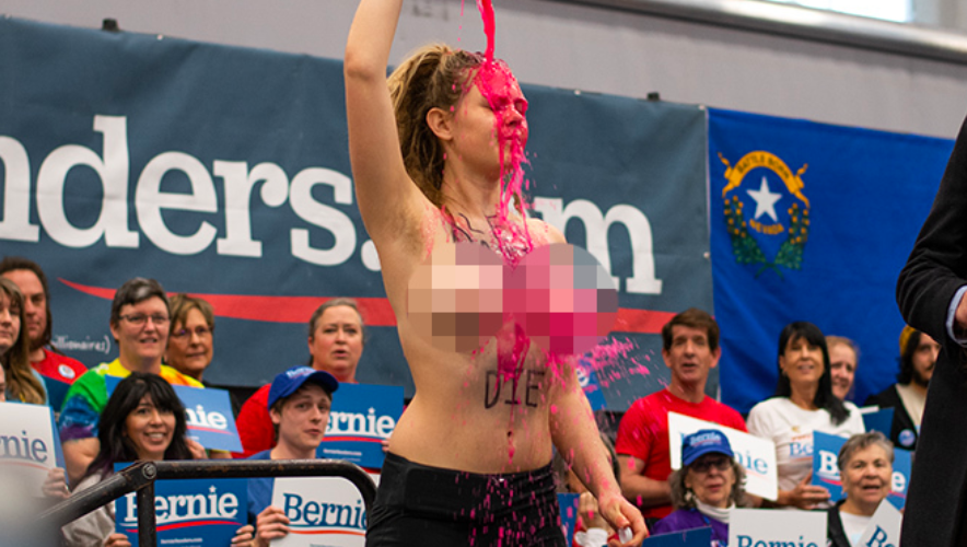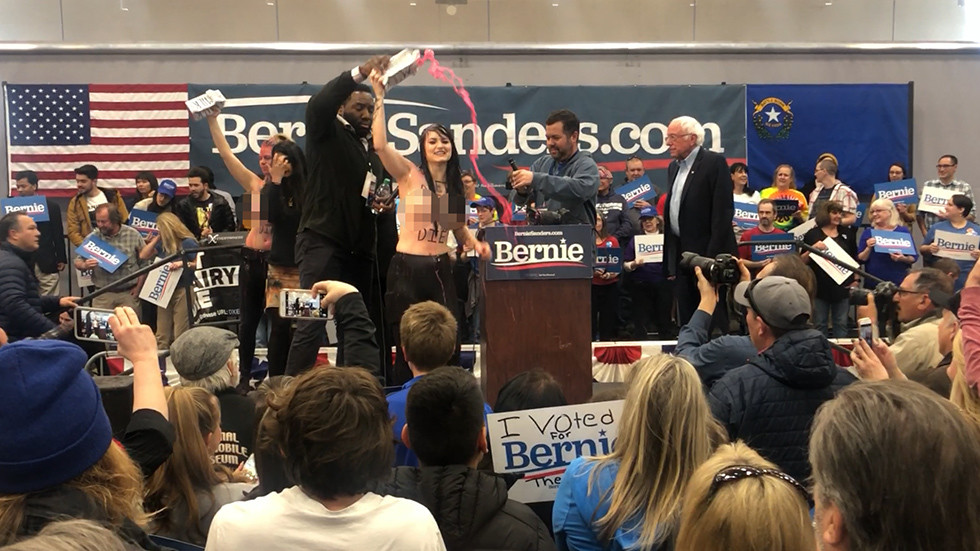 A group of anti-dairy activists, including topless women, upstaged Democratic race frontrunner Bernie Sanders at his own campaign rally ahead of the Nevada primaries. The senator kept his cool, laughing off the stunt, however.