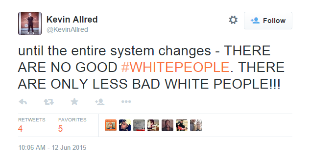 Allred says that white people can’t be described as good until the “entire system” is changed. But then he goes on to say that, “I didn’t say there are ‘no good white people’ – I meant until the system changes completely to erase these stereotypes in general, no white people should be seen as de facto good. We (white people) should be seen in grades of ‘less bad’ to balance out the ways other groups are unfairly seen.”