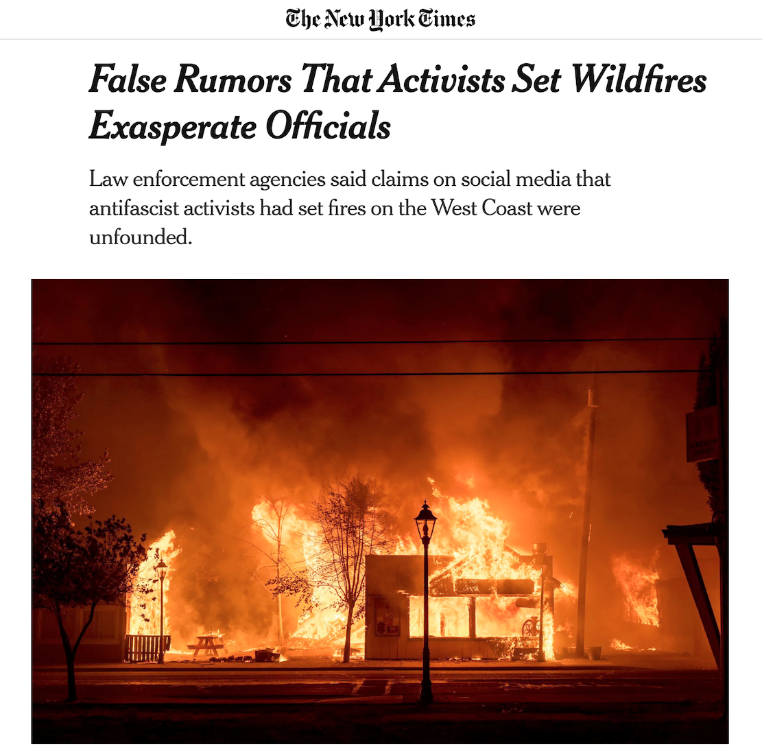Obviously, identifying whether a fire is natural, an accident or arson is rather complicated, but the NYT headline is ridiculously misleading. The authorities in Oregon are investigating the fires as arson, they’re just saying they have no proof it’s Antifa.