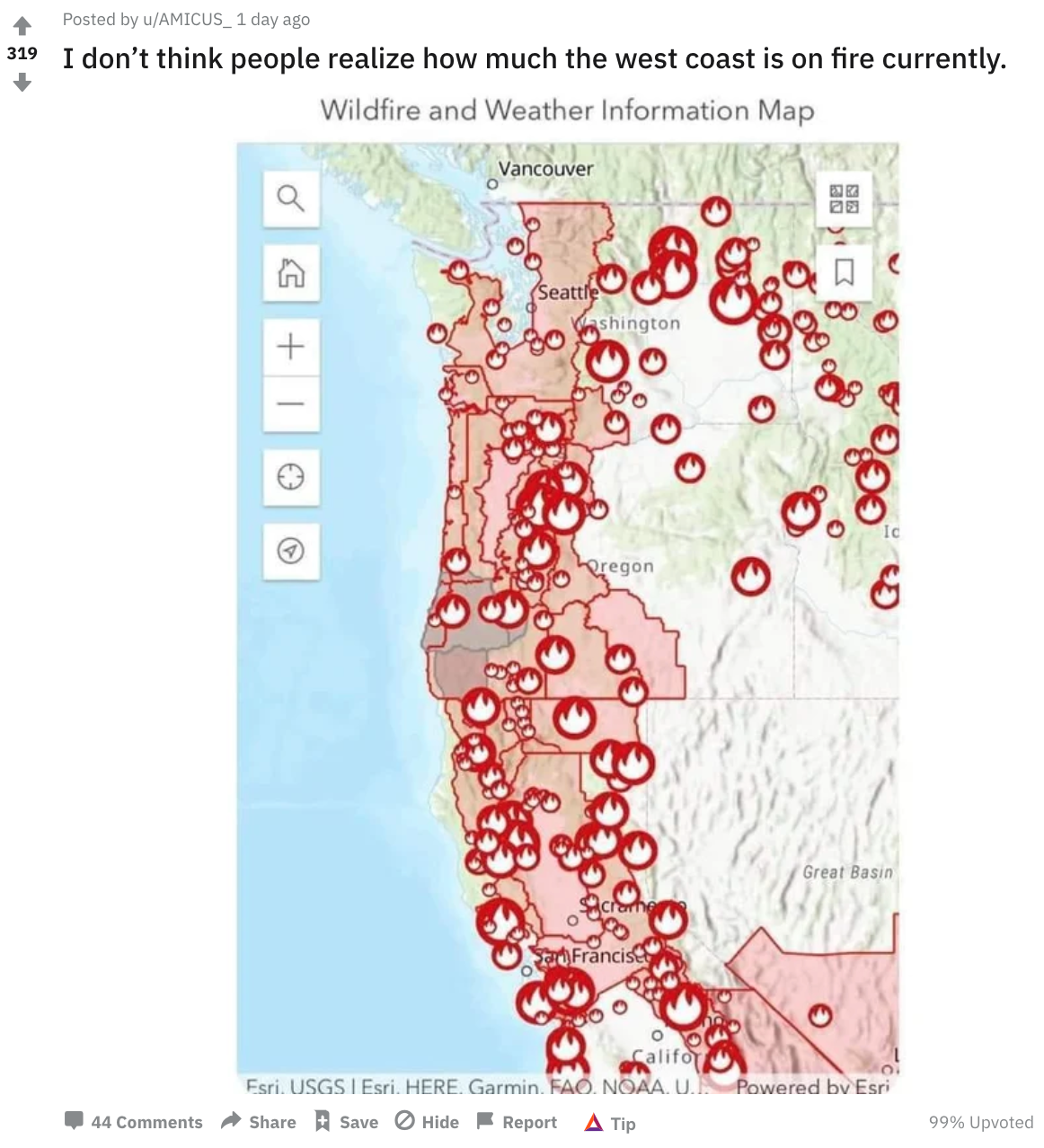 The gender reveal thing, the refusal to print maps, the general lack of reporting on just how extreme this actually is (biggest in history) – all of that would fit with a program to cover up Antifa involvement in these fires.