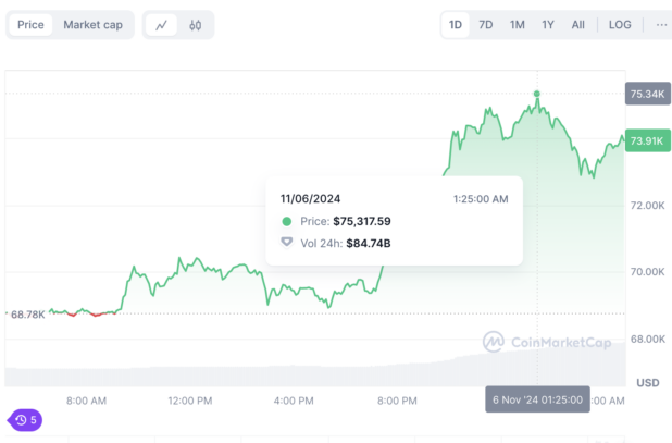 It’s cooled off slightly now at time of writing, but during the period where it first became obvious Trump was going to win, the biggest cryptocurrency hit $75,000, a new all-time high.