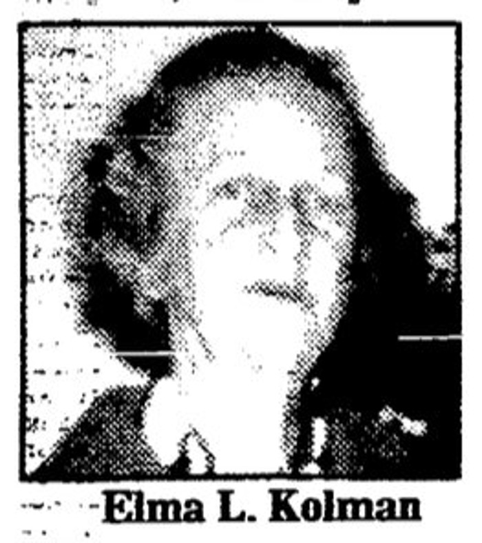 A passerby found Elma Kolman’s fully-clothed body in a vacant lot in the 300 block of Monticello Avenue on April 7, 1984. A cord from the hood of her jacket had been wrapped around her neck.