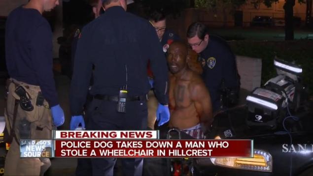 A 54-year-old man allegedly broke into a man’s Hillcrest apartment early Thursday and rode off on a stolen electric wheelchair, but was arrested nearby after being bitten by a police dog, authorities said.
