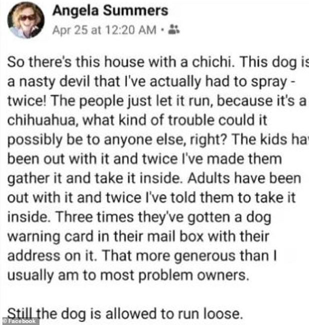 Summers had posted on her Facebook page two days before she was shot dead about her problems delivering a COVID-19 stimulus check to a house with a chihuahua on her round, according to Fox59.