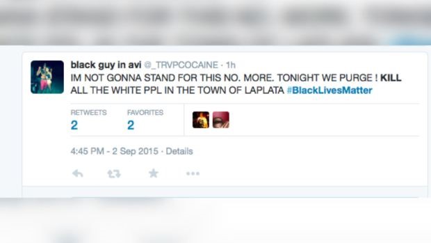 The message was uncovered Wednesday afternoon when La Plata Police were alerted to a post on Twitter that read, “IM NOT GONNA STAND FOR THIS NO. MORE. TONIGHT WE PURGE! KILL ALL THE WHITE PPL IN THE TOWN OF LA PLATA.”