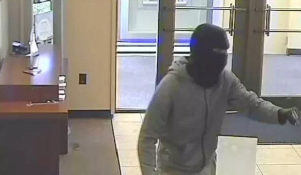 The suspect entered the bank carrying a black revolver at 12:30 p.m. He is a black male, under 40 and was wearing a grey hooded sweatshirt, tan pants, a black ski mask and gloves.