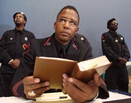 And Mister Malcolm X, he consistently teaches us self defense. The most honorable Elijah Muhammad continuously teaches us self defense. The honorable Marcus Mosiah Garvey teaches us self defense, and we know, our leader and our teacher the honorable Khalid Abdul Muhammad teaches us self defense. What am I saying? Right now it’s time to build up that army. Right now it’s time for us to build up those corps, those troops. It’s time to get strong. It’s time for lifting weights and working out and going to the gun range and all of that.