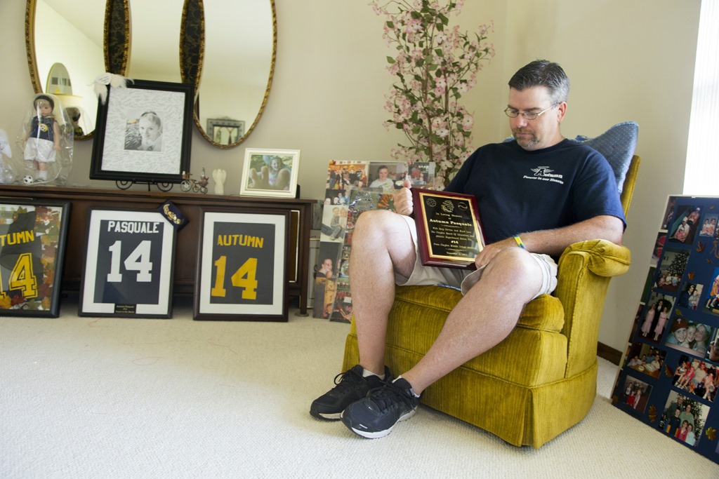 Anthony Pasquale stops to visit his daughter at the Cedar Green Cemetery every morning, then returns once or twice more during the day. He sits on the small white bench and faces the polished granite headstone, etched with a hologram of Autumn on one side and the things she loved on the other — bicycles, soccer balls, cheerleading, skateboards.