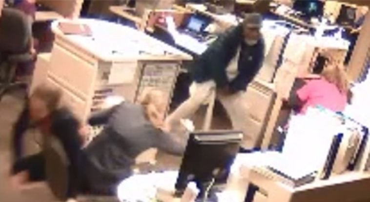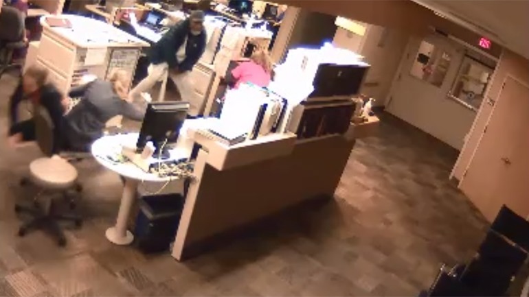 In the video, released by the Maplewood Police Department, Logan can be seen running through the nurse’s station wielding a metal pole. He then hoists the pole over his head and begins hitting nearby nurses who are attempting to flee the scene.