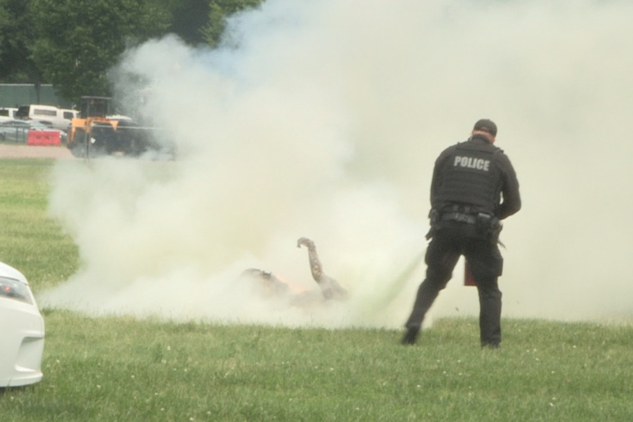 Officers are seen racing over to the man, including one armed with a red fire extinguisher, and police cruisers pulling up with lights flashing.