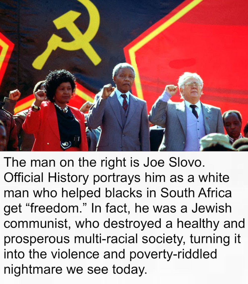 The Jew Joe Slovo led the Nelson Mandela communist uprising in South Africa. In America, Martin Luther King was trained by Jewish communists, and all of his advisors and speech writers were Jewish communists. (Note: Mandela was a seriously deviant, violent psychopath and a terrorist who advocated and probably invented the practice of “necklacing,” which is filling a tire full of gasoline and putting it around someone’s head and lighting it on fire. Conversely, King was a sexual degenerate with a low IQ who was fully a tool of the Jews around him.)