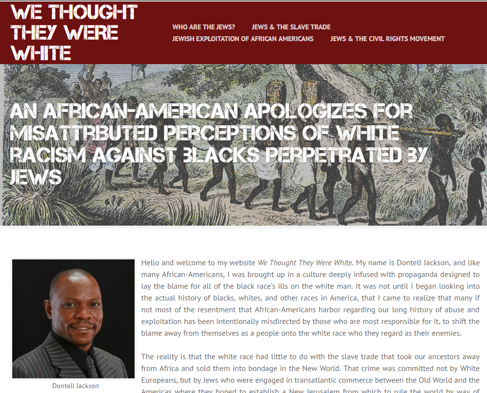 Hello and welcome to my website [sic] We Thought They Were White. My name is Dontell Jackson, and like many African-Americans, I was brought up in a culture deeply infused with propaganda designed to lay the blame for all of the black [sic] race’s ills on the white[sic] man. It was not until I began looking into the actual history of blacks, whites, [sic] and other races in America, that I came to realize that many [sic] if not most of the resentment that African-Americans harbor regarding our long history of abuse and exploitation has been intentionally misdirected by those who are most responsible for it, to shift the blame away from themselves as a people onto the white race [sic] who they regard as their enemies.