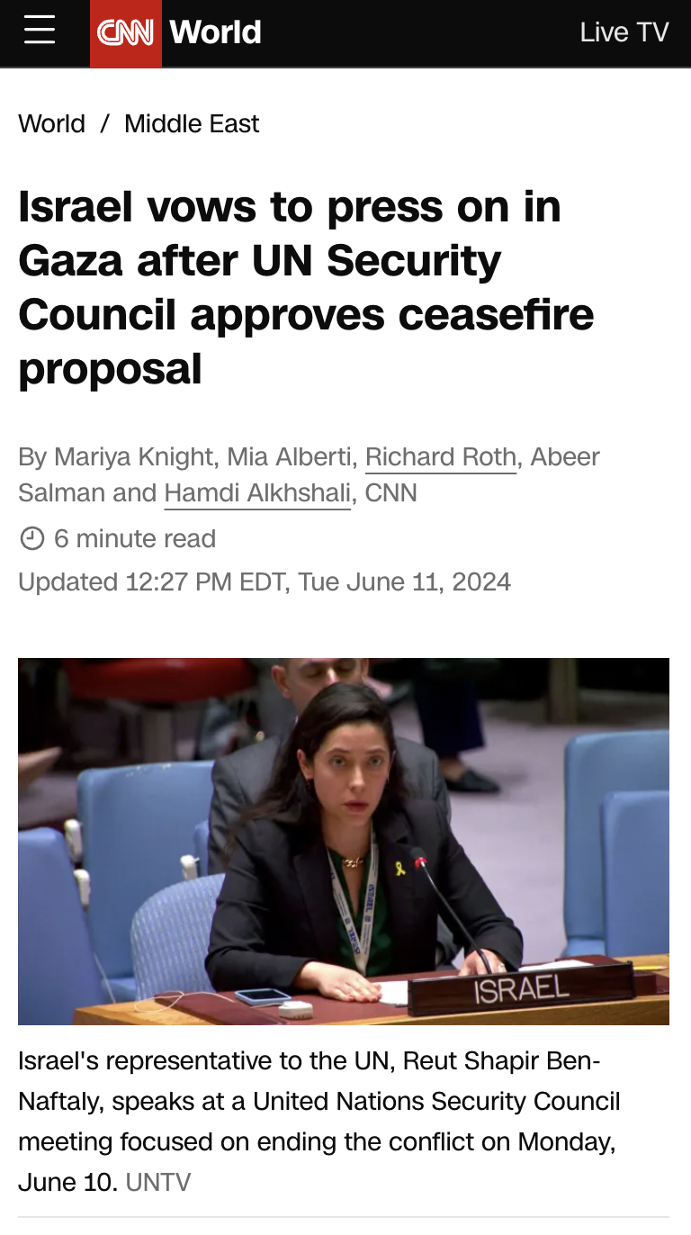CNN, reporting on comments by Israel’s UN representative made on June 10th: