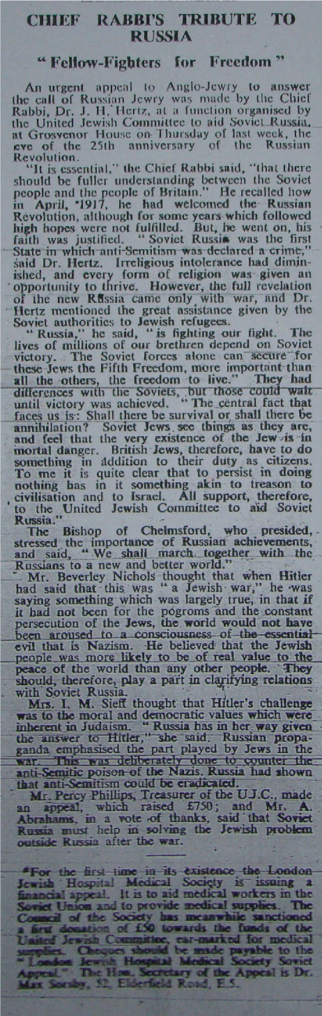Yet another great find from The Black Rabbit of Inlé, about a meeting called by the United Jewish Committee in London on November 5, 1942, the eve of the 25th anniversary of the Bolshevik revolution – where Chief Rabbi Hertz praised the Soviet Union for outlawing anti-Semitism, and Israel M. Sieff stated that Bolshevism was based on ancient Jewish moral values.