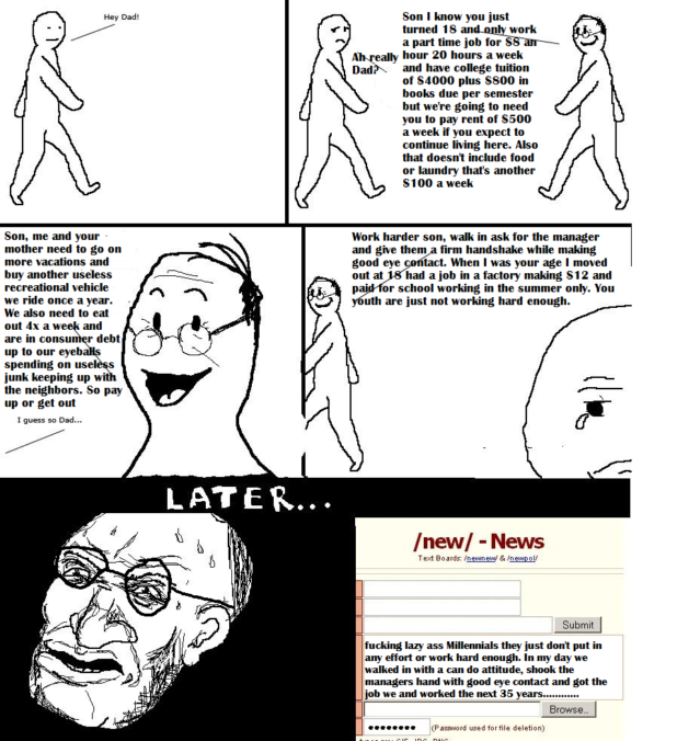 At this point, I honestly think that mad AF Millennials are going to just start attacking these Boomers on campus. All it will take is just one ill-timed and unrequested lecture on bootstraps at a creative writing seminar. The sheer hypocrisy of a state-subsidized, pension-collecting, house-owning, brain-addled Boomer chiding the whippersnappers about how good they have it will no doubt cause someone to just fucking snap.