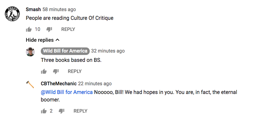 This one is not hip to the JQ, but seems more open to constructive dialogue. However, he appears to already be aware of the counter-Semitic arguments that the right has presented. He replied to the suggestion to read Kevin MacDonald with snark and refered to the trilogy as “three books based on BS.”