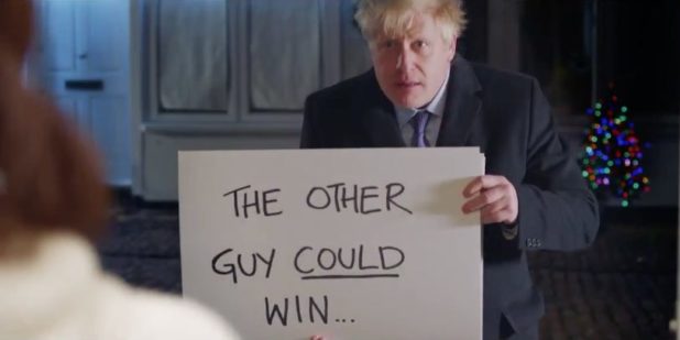 In Johnson’s remake of the iconic Christmas-carol scene, the British prime minister imitates the character Mark (Andrew Lincoln), holding up cards telling a woman in the scene — mimicking the film’s Juliet (Keira Knightly) — that her vote has never been more important.