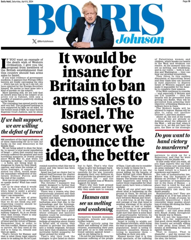 In a scathing column in the Daily Mail, Johnson wrote that the attacks on the WCK convoy were “shattering” but then defended Israel, claiming it was sending warnings of the IDF’s attacks, which are “trying to use precision munitions”.