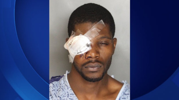 A mugshot of Addson shows the suspect in a hospital gown with his eye bandaged.