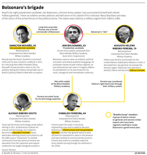 Most of Bolsonaro’s inner circle have retained close ties to Brazil’s current military leadership. For example, Antonio Hamilton Mourão, a four-star general who is serving as Bolsonaro’s vice presidential running mate, just retired from active duty in February.