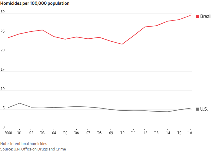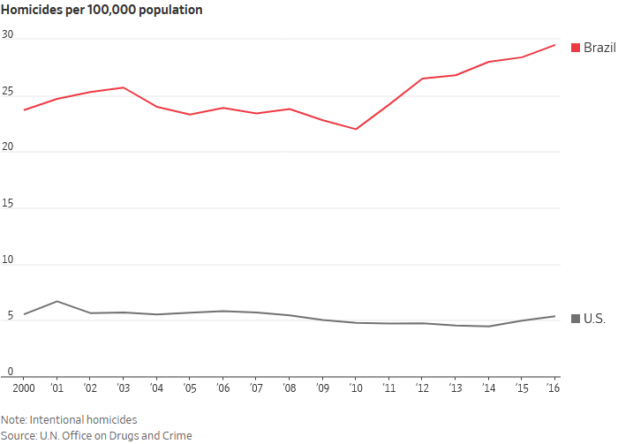 Brazil is one of the most violent countries in the world. One in four people live below the poverty line, on less than $5.50 a day. The government spends about one fifth of GDP on social programs, but this does not result in meaningful changes due to corruption and inefficiency.