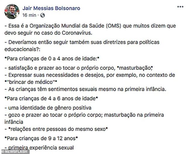 Bolsonaro added in his Facebook post young people aged nine to 12 ‘have their first sexual experience,’ according to his reading of WHO guidance.