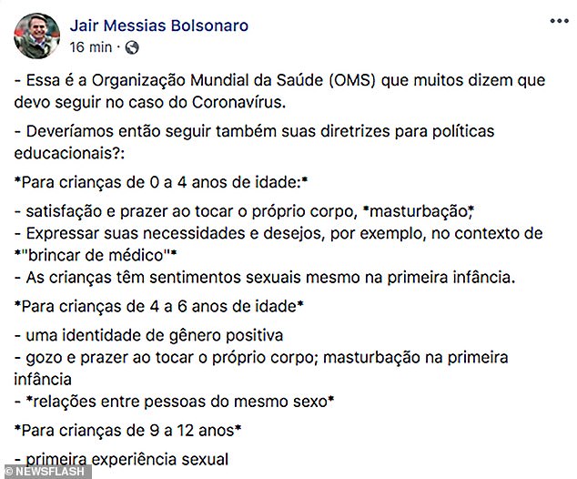 Bolsonaro, 65, ranted online about the WHO’s alleged recommendation children under four derive ‘satisfaction and pleasure upon touching their own body *masturbation*’.