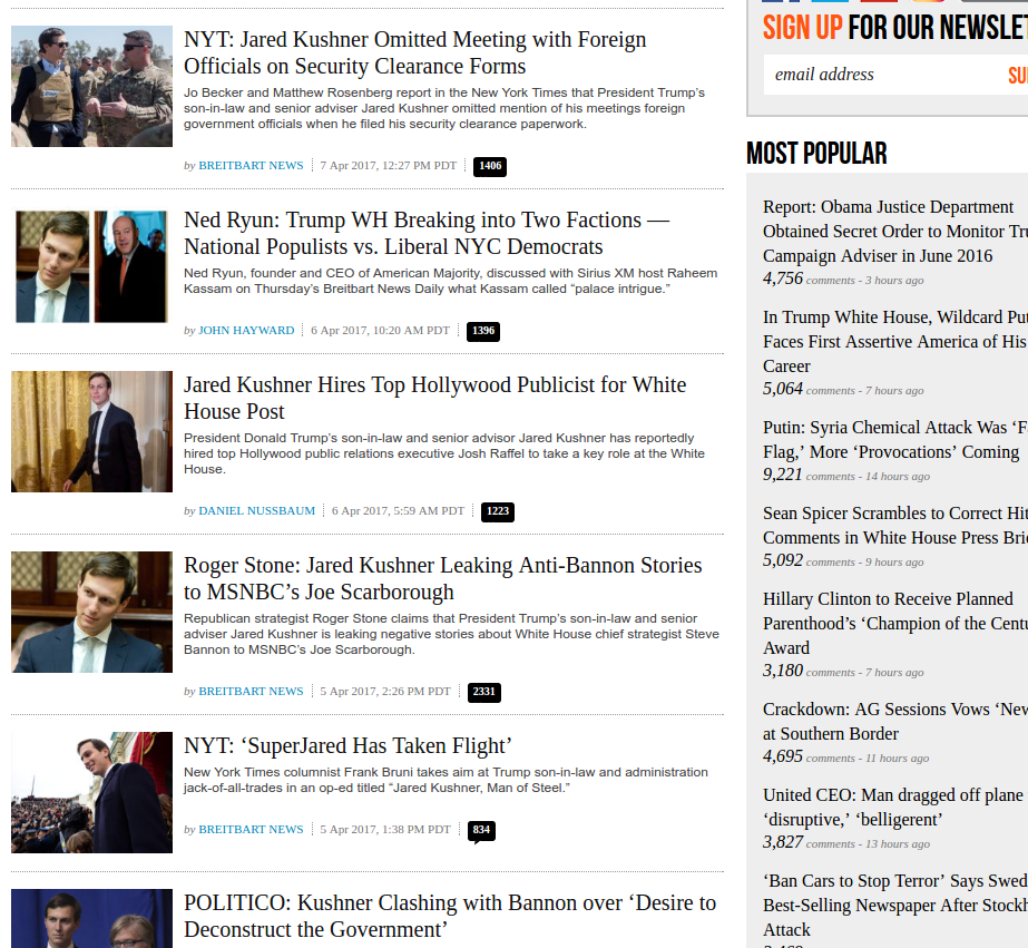 On Wednesday night, for instance, Breitbart published three stories critical of Kushner and promoted them heavily on its homepage. The next day, Axios reported that Bannon had told associates, “I love a gunfight.”