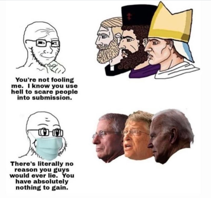 Firstly, you’d have to accept the leftist campaign to claim that the vax is safe and that everyone needs it. You would then have to dismiss the entire framework of control the left has built up around the vax as coincidental. You would have to disregard all of the (typically right-wing) medical arguments against the vax as wrong or part of a conspiracy. You would also have to dismiss all of the data showing that the vax is harmful and does not even work as a left-wing conspiracy. Fauci being a liar would also have to be a leftist conspiracy. You would have to do all of that as a prerequisite to the paranoid theory of the left using a fakeout to make you not take the vaccine by forcing you to take the vaccine, and then also assume that they’re not really going to force anyone to take the vaccine (because actually, they don’t want them to take it).