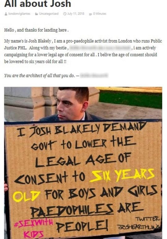 The trolls even photoshopped images of Blakely to make it look like he had publicly demonstrated in a campaign to reduce the age of consent to six years old.