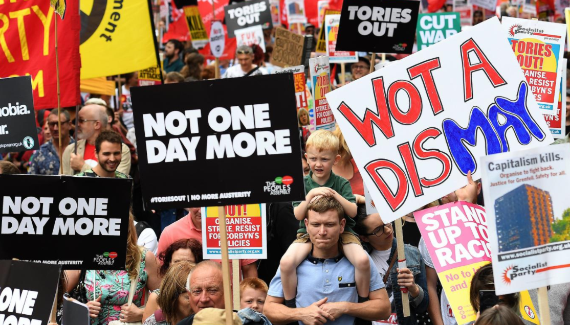 Protesters arrived with banners branding messages of defiance against austerity and the Tory Party such as “Austerity kills” and “Kick the Tories out”, and people could be heard chanting “Not one day more” as the crowd moved through the streets of the capital.